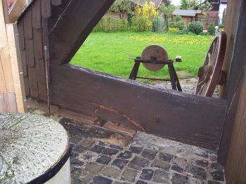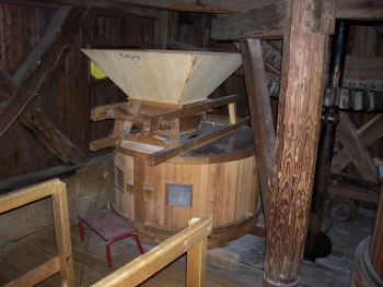 Mühle mit bespannten Flügeln anlässlich eines MühlentagesBlick von Südosten auf die MühleKraftumsetzung, ausgehend von der Flügelwelle und dem Stirnrad Der Mahlgang mit Trichter und BütteSchuppen am Fuß der Mühle