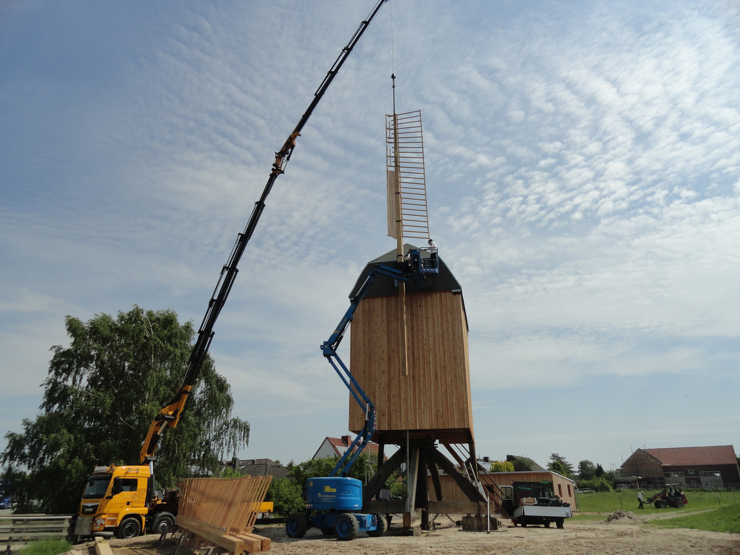 Vorheriges Bild Nächstes Bild Neubau Mühle 23.5.2017: Der erste Flügel wird an der Welle befestigt Neubau Mühle 23.5.2017: Der erste Flügel wird an der Welle befestigt
