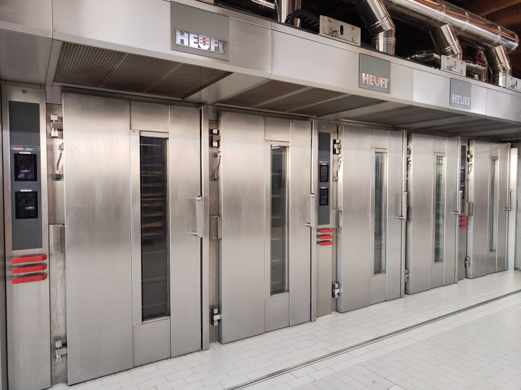Im Anschluss haben uns Carsten und Jan Richter durch den Betrieb geführt. Dies war sehr beeindruckend! Die Themen Ergonomie, Entlastung der Mitarbeitenden sowie Vereinfachung der Prozesse werden bei den Richters groß geschrieben. So werden beispielsweise ganze Gestelle in die Öfen gefahren, damit die Bäcker nicht jedes Brot einzeln in die Öfen hinein- und wieder hinausheben müssen.